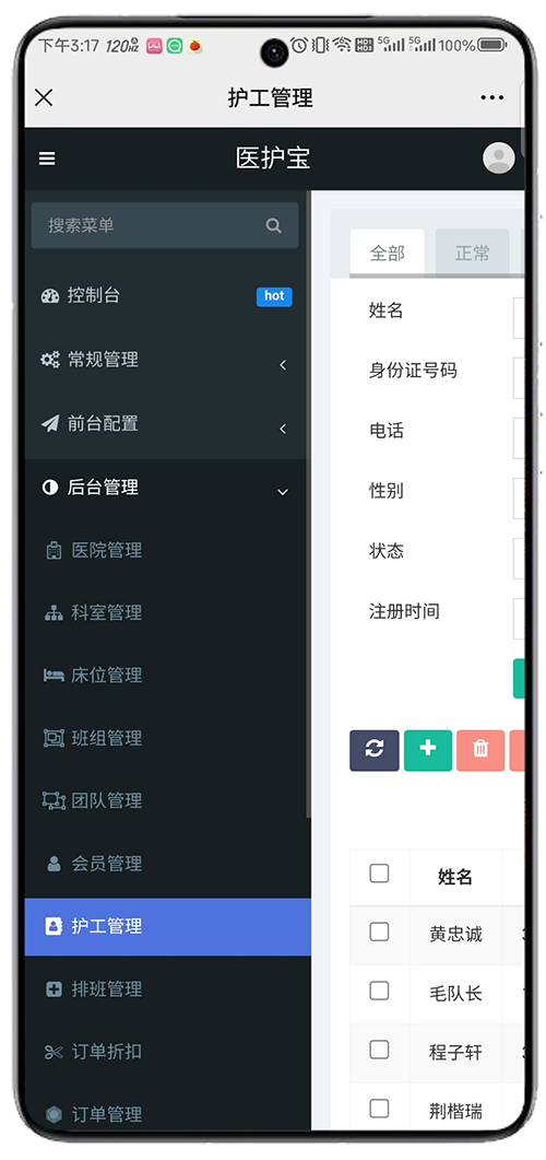 医院管理,可自定义设置主管信息。支持护工、组长、队长、主管四级架构。