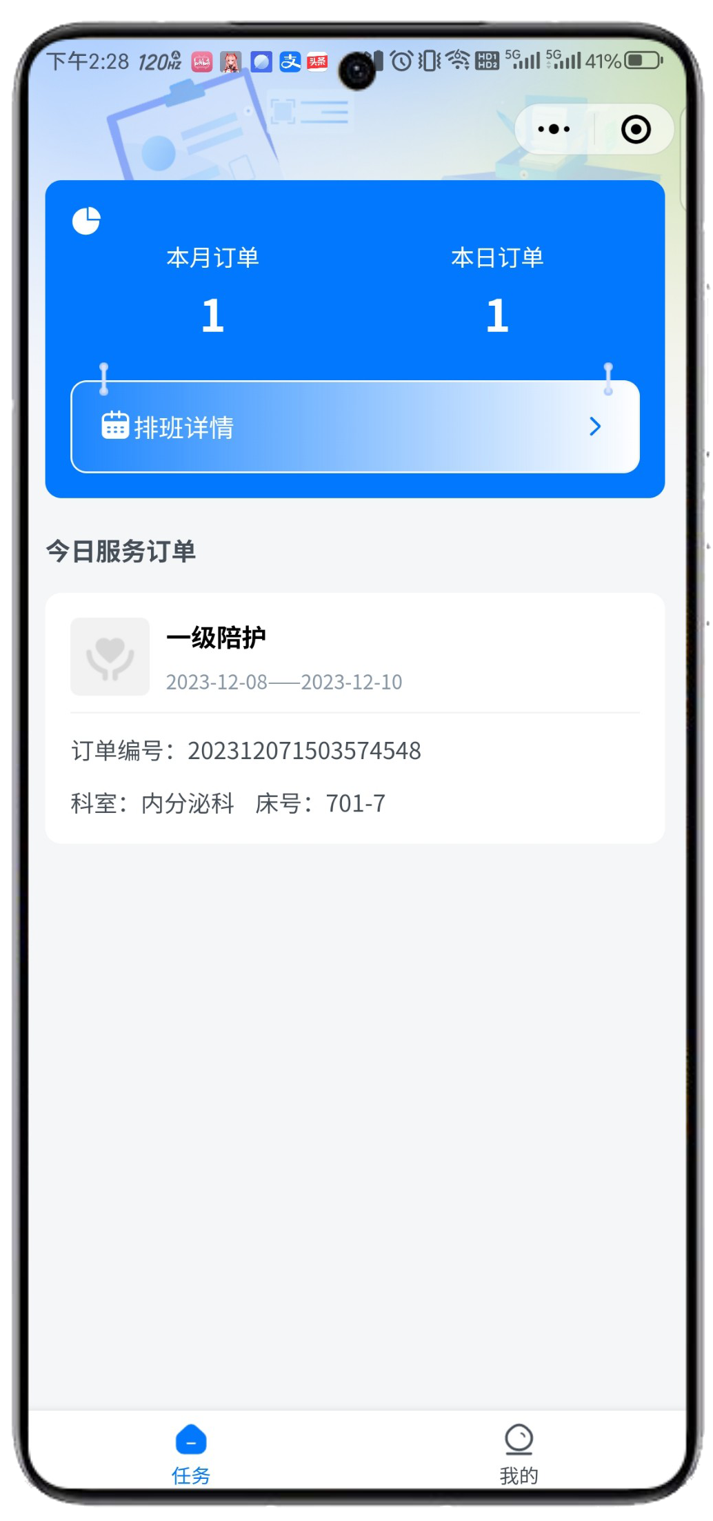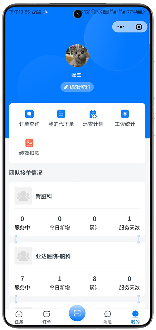 主管或组长使用,代下单,巡检,订单统计等。与护工端共用同一个小程序。